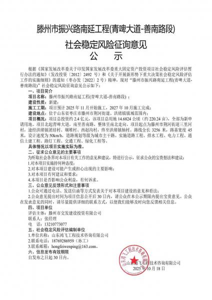 滕州市振興路南延工程(青啤大道-善南路段)社會(huì)穩(wěn)定風(fēng)險(xiǎn)征詢意見公示