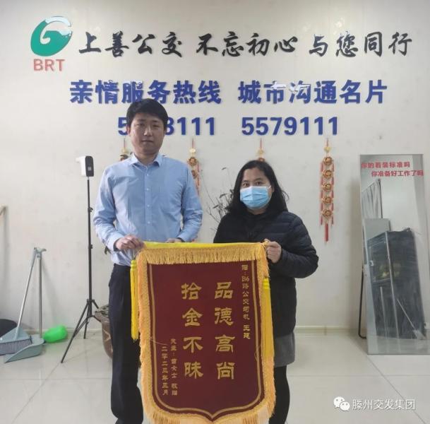 原來,苗女士在乘坐BRT-B6線路時,不慎將手機(jī)遺落在車輛上,下車后,才發(fā)現(xiàn)手機(jī)丟失,萬分著急的苗女士趕忙來到上善公交調(diào)度中心,尋求幫助。工作人員聽完苗女士的敘述后,迅速通過調(diào)度平臺向B6線所有車輛下發(fā)了尋物信息。此時,行駛至B6薛城換乘中心清掃車內(nèi)衛(wèi)生的駕駛員王建也發(fā)現(xiàn)了車廂后部內(nèi)側(cè)座位上的這部手機(jī),正準(zhǔn)備打電話將情況報送給調(diào)度中心。1個小時后,王建師傅從BRT薛城換乘中心趕到滕州換乘中心,并將手機(jī)交到苗女士手中。為表示感謝,苗女士特意定制了一面錦旗,專程來到調(diào)度中心,表達(dá)由衷的謝意。