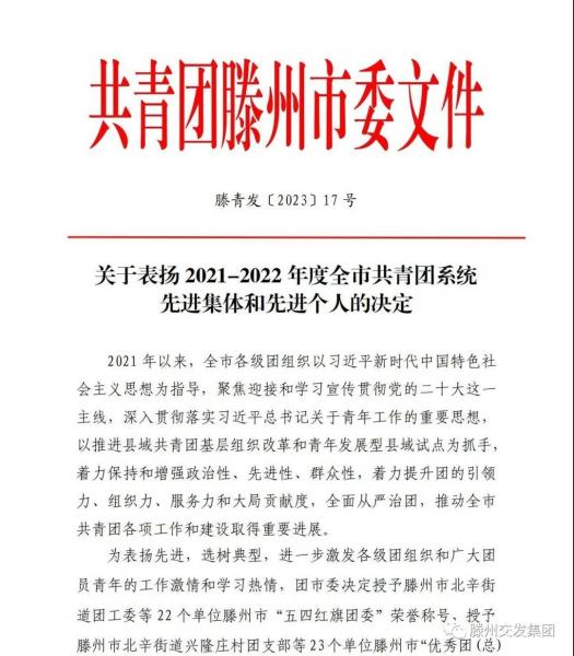 6月26日,共青團(tuán)市委下發(fā)了《關(guān)于表揚(yáng)2021-2022年度全市共青團(tuán)系統(tǒng)先進(jìn)集體和先進(jìn)個(gè)人的決定》(滕青發(fā)〔2023〕17 號(hào)),滕州市交通發(fā)展集團(tuán)有限公司團(tuán)委榮獲2021-2022年度滕州市五四紅旗團(tuán)(工)委榮譽(yù)稱號(hào)。同時(shí),集團(tuán)張鐸同志,榮獲2021-2022 年度滕州市“志愿服務(wù)先進(jìn)個(gè)人”。