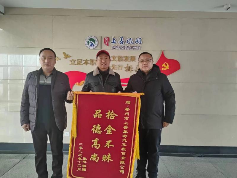12月20日上午,市民張先生將一面印有“拾金不昧 品德高尚”的錦旗送到交發(fā)集團(tuán)上善旅游汽車租賃有限公司,對(duì)公司駕駛員和工作人員表示感謝。