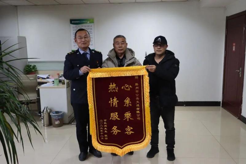 12月29日下午,市民洪先生專程來到交發(fā)集團(tuán)公交公司,將一面印有“心系乘客 熱情服務(wù)”的錦旗送到工作人員手中,對公司工作人員熱心接力幫助其找回失物表示感謝。