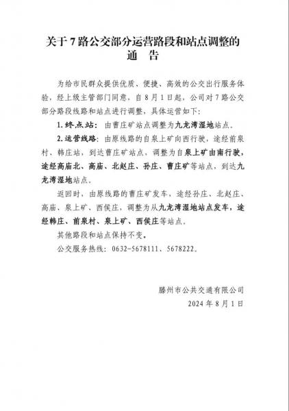 關(guān)于7路公交部分運營路段和站點調(diào)整的通告
